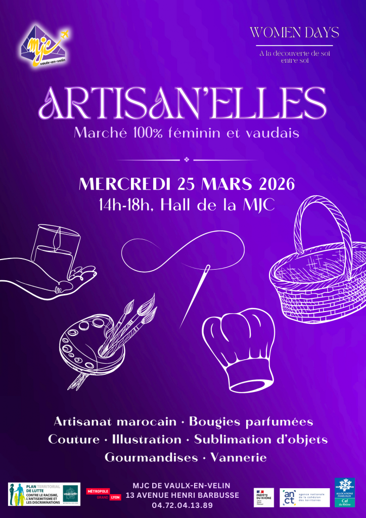 Mercredi 25 mars, le marché « Artisan’elles », marché de créatrices 100% vaudais, fait son grand retour dans le hall de la MJC ! L’occasion de soutenir l’artisanat et l’entrepreuneuriat des femmes vaudaises et échanger avec elles ! De l’illustration à la couture, en passant par les bougies parfumées ou l’artisanat marocain, vous y trouverez de nombreuses pépites !